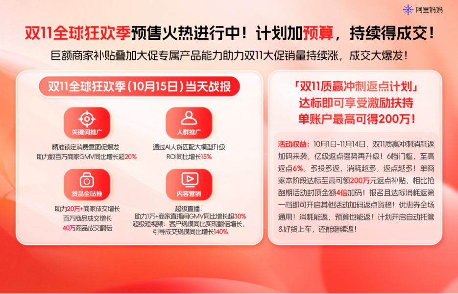 为助力商家在双11全周期内实现更大的突破,阿里妈妈30亿补贴红利持续发放中。商家参与阿里妈妈“双11质赢冲刺返点计划”等活动,可享200万反哺补贴。其中,万相台AI无界营销激励计划下,单个客户最高可得260万。这不仅是真金白银的激励,更是为更关键的大促后半程注入的一剂“确定性”强心针,为商家的全域生意爆发提供源源不断的动能。