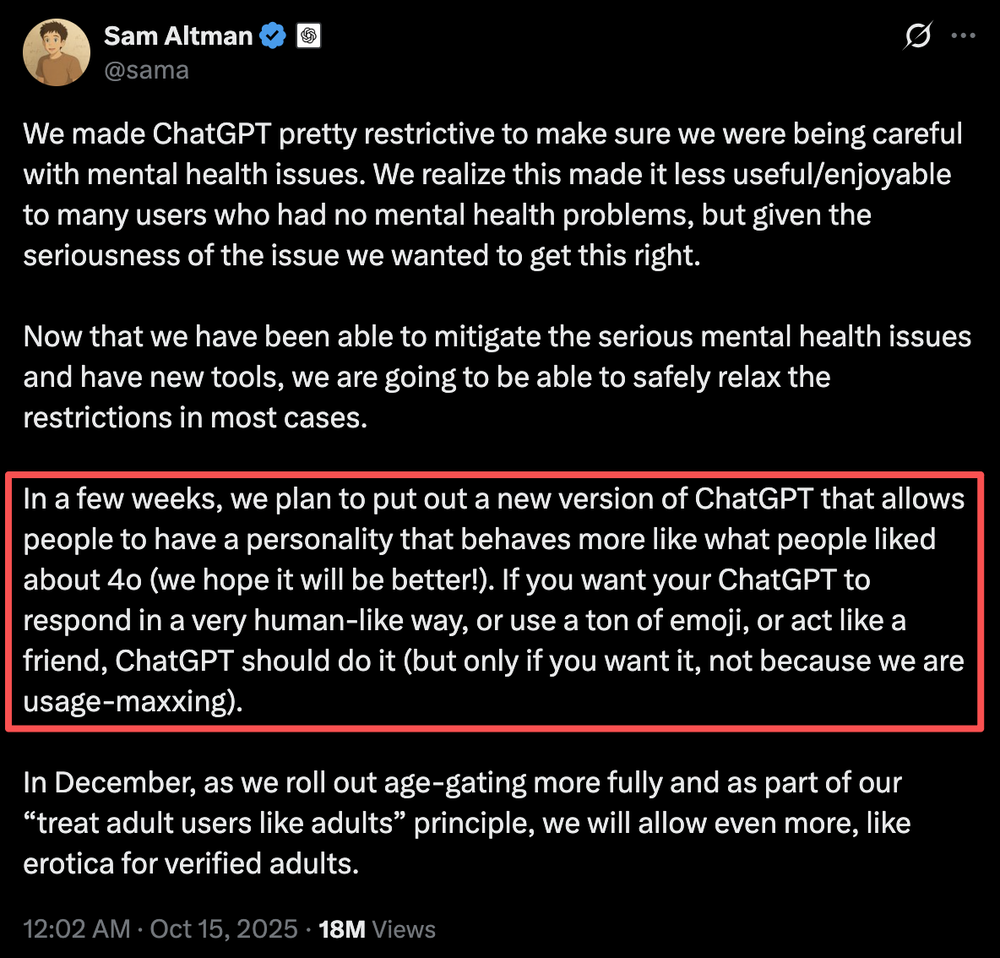在奥特曼的官宣中,除了成人内容,OpenAI还计划推出新版本的ChatGPT,其行为更接近用户喜欢的4o模型。此前,GPT-5因过于严格的限制被批评‘对许多没有心理健康问题的用户来说变得不那么有用/无趣’。为此,OpenAI推出了一些工具以‘更好地检测’用户的精神困扰状态,但用户似乎并不买账。