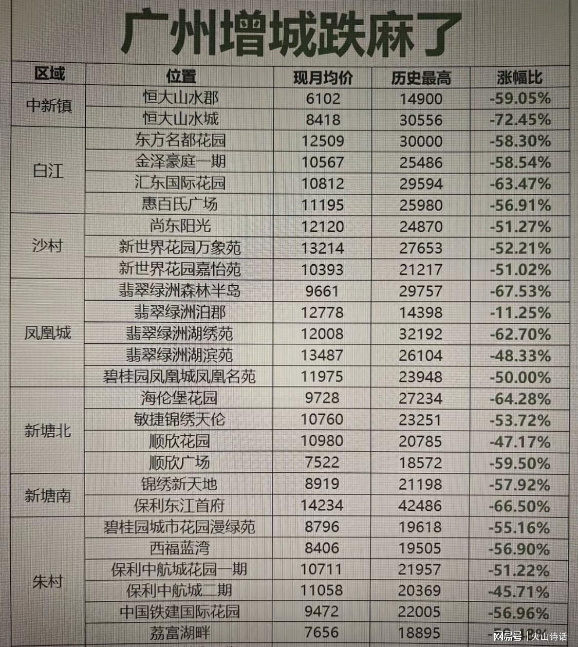 数据显示,增城区多楼盘房价较历史高位下跌超50%。其中,恒大山水城跌幅达72.45%,翡翠绿洲森林半岛(-67.53%)、保利东江首府(-66.50%)等项目跌幅均超60%。从区域看: