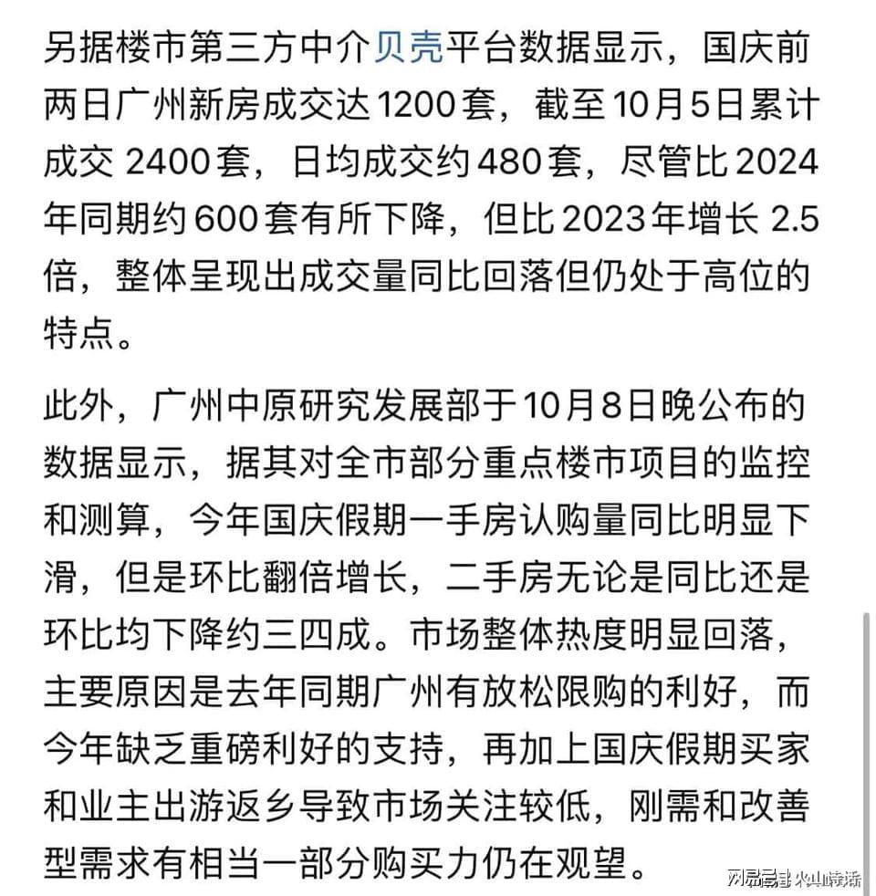 据广州市住建局数据,国庆中秋假期(10月1-8日)一手住宅网签12.12万平方米,同比增长28.7%。但市场监测显示,一手房认购量同比明显下滑,二手房成交同比降幅约三四成。天河、海珠、增城新塘等板块完成度达70%,而番禺、黄埔等外围区域仅40%。