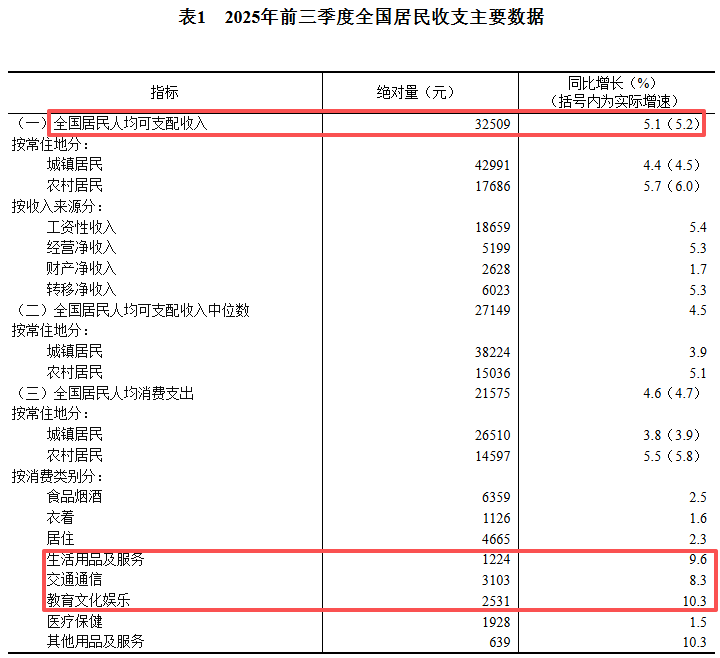 最后,我们来看看居民收入的表现。前三季度,全国居民人均可支配收入增速为5.1%,扣除价格因素后实际增速为5.2%,与GDP增速持平。其中,工资性收入增长了5.4%。增加收入是刺激经济和扩大内需的最优解。