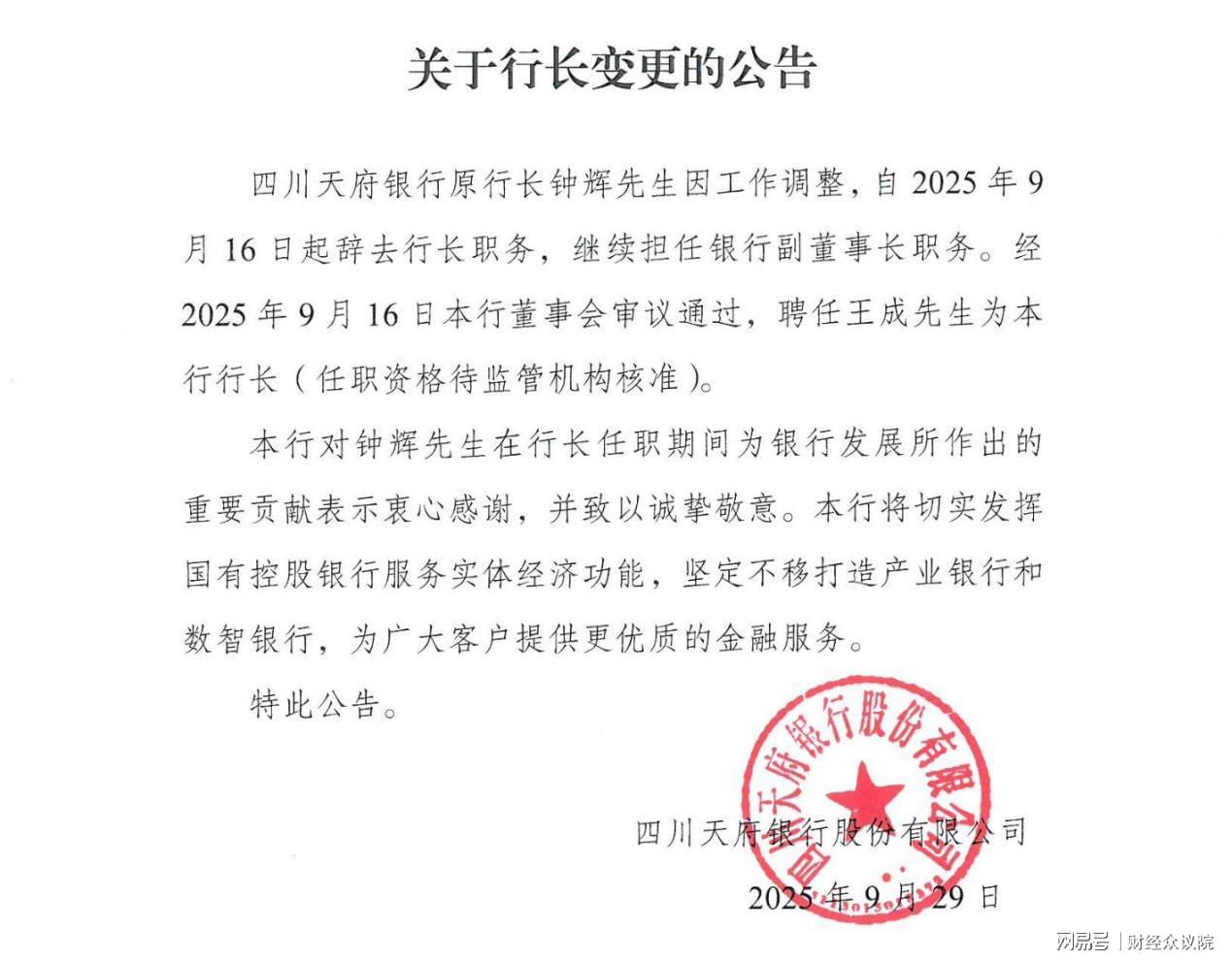 据第一份公告显示,该公告以董事会的名义发出,盖章日期为2025年9月28日。公告内容指出,由于工作另有安排,钟辉辞任天府银行行长一职,但将继续担任公司副董事长。这一安排在银行业内并不常见,因为通常行长辞任后,会彻底离开原银行的管理层。