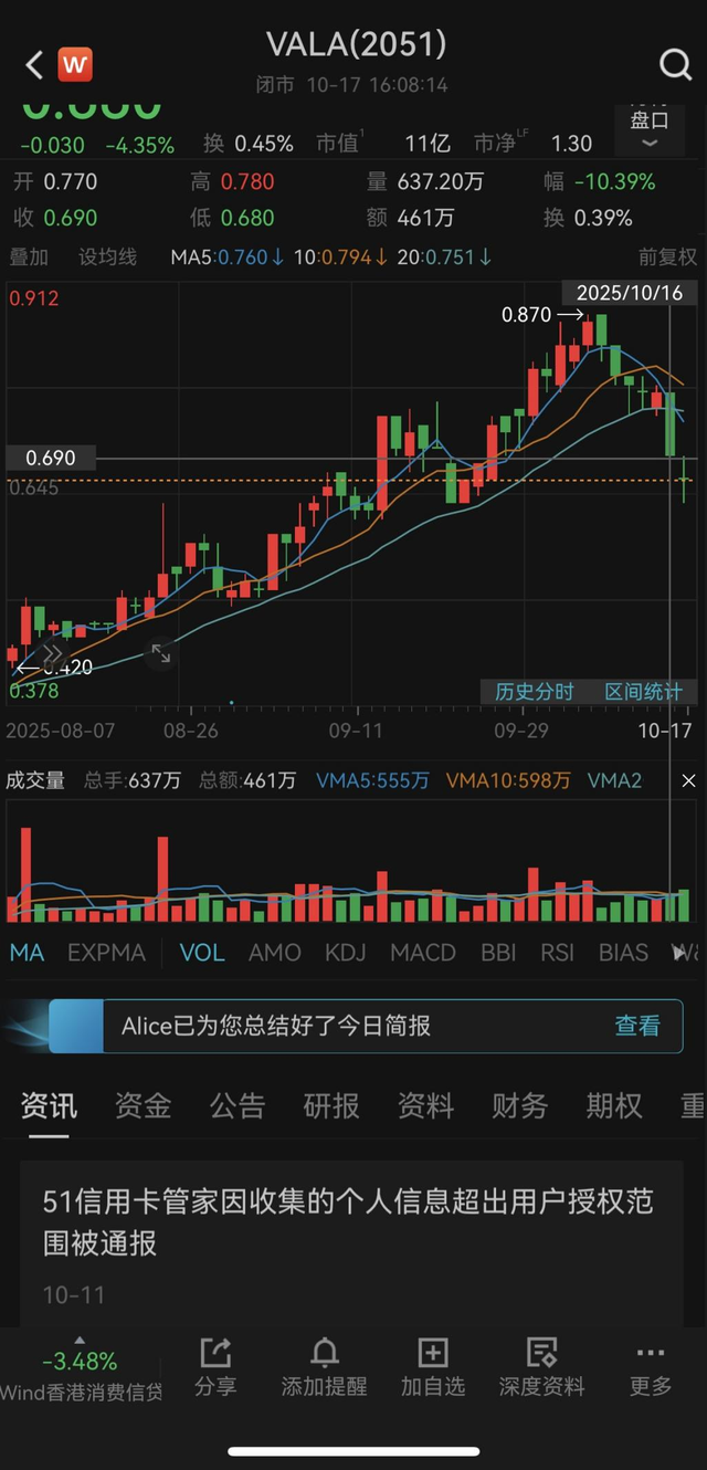 10月10日,国家网络安全通报中心发布最新通报,34款移动应用因违法违规收集个人信息被点名。其中,上市公司51信用卡旗下App"51信用卡管家"因超范围收集用户数据登上黑名单。这一消息引发资本市场剧烈反应,公司港股(2051.HK)股价连续7个交易日下跌,10月16日单日跌幅达10.39%,截至发稿前股价报0.67港元,较通报前累计下跌22%。