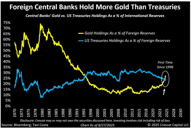 这场黄金盛宴的参与者已从普通投资者扩展至华尔街对冲基金、各国央行等机构投资者。值得注意的是,黄金在全球央行储备中的占比自1996年后首次超越美债,中国9月黄金储备增长294亿美元,占比升至7.68%创十年新高。这场静悄悄的资产大迁徙,正引发市场对黄金配置价值的深度思考。