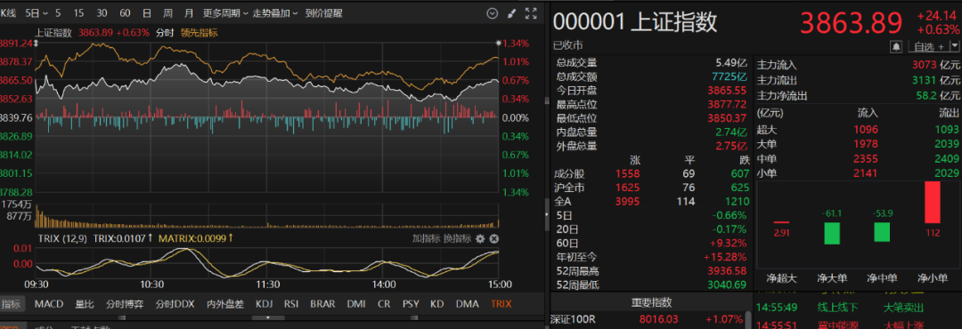 10月20日,A股市场迎来全面反弹,三大指数集体收涨。截至收盘,沪指上涨0.63%,深证成指涨幅达0.98%,创业板指更以1.98%的涨幅领涨。当日沪深两市成交额1.74万亿元,虽较前一交易日缩量约2000亿元,但市场赚钱效应显著提升,近4100只个股实现上涨。