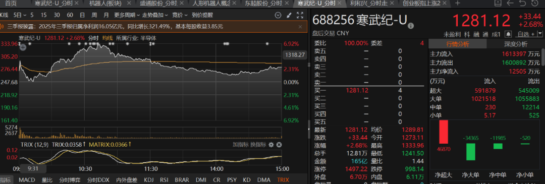 经历上周回调后,科技板块今日强势反弹,核心催化剂来自寒武纪的"王炸"级三季报。数据显示,2025年1-9月公司实现营业总收入46.07亿元,同比激增2386.38%;归母净利润16.05亿元,同比大幅改善。其中第三季度单季营收17.27亿元,同比增长1332.52%,净利润5.67亿元。