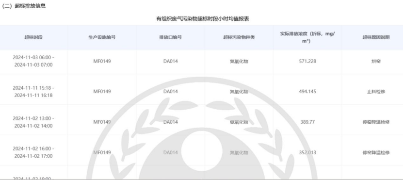 双欣化学作为双欣环保的子公司,其营收占双欣环保总营收的一半以上,属于典型的“子大于母”情况。而双欣化学同样也是环境重点监控单位/重点排污企业。根据双欣化学2024年的排污许可执行报告,该公司在当年的废气排放浓度曾出现近百次的超标现象。这与双欣环保在招股书和回复问询中所称的排放达标明显不符。超标污染物种类涉及氮氧化物和颗粒物等,超标原因多为停窑、设备故障、烘窑等。