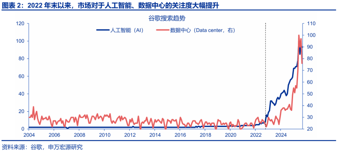 微观视角下,过去几年美国头部科技企业资本开支节节攀升,市场热度同步提升。2025年二季度,美股Mag 7公司资本开支规模接近1000亿美元,相较三年前同期规模翻倍,同比增速高达64.8%,AI基础设施、云计算、智能算法是重要领域。并且,市场对于美国科技企业资本开支的预测仍在不断上修;AI的热度并不仅局限于企业圈,谷歌趋势显示,2023年以来“人工智能”、“数据中心”词条热度大幅提升,公众对于AI科技革命、投资的关注度呈现爆发式增长。