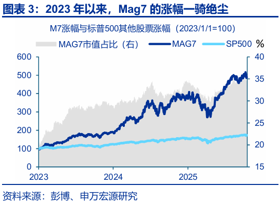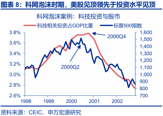 中观视角下,美国AI相关投资远超其他行业,AI资本开支已是美股重要驱动力。美国AI相关投资呈现出“一枝独秀”的特征。从GDP口径来看,2022Q4-2025Q2,美国电脑设备投资增长61%,远强于交运设备、工业设备;从上市公司视角来看,Mag7资本开支占标普500比重已经达到30%左右。与此同时,自2023年以来,美国头部科技公司涨幅对美股贡献较大,Mag7涨幅接近400%,而标普500仅上涨约70%,资本开支与股价同步上行,似乎与2000年科网泡沫前期类似。从历史回溯角度,美国资本开支周期与股市周期也的确存在一定关系,根据2000年初经验,美国股市见顶领先于科技投资占GDP比重见顶约2个季度。