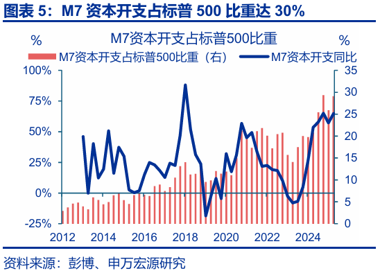 中观视角下,美国AI相关投资远超其他行业,且AI资本开支已是美股重要驱动力。2022Q4至今,美国电脑设备投资增长61%,远强于其他投资;自2023年以来,美国头部科技公司贡献了美股大部分涨幅,M7资本开支占标普500比重上升至30%,资本开支与股价同步上行。