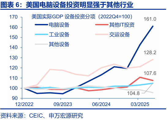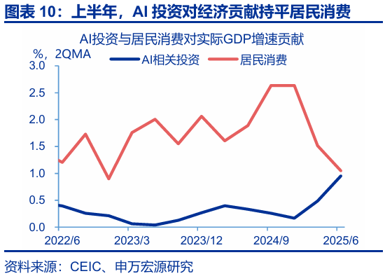 宏观视角下,2025年AI投资对经济增速的贡献与居民消费基本持平,但不可忽视进口的拖累。2025年上半年,美国居民消费、AI投资分别贡献经济增速1.1、1.0个百分点;但是,自2023年以来,电脑设备“净投资”(投资-进口)对经济呈现负贡献,不可忽视来自于进口的拖累。