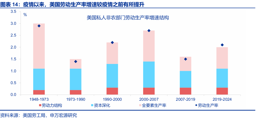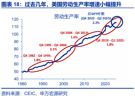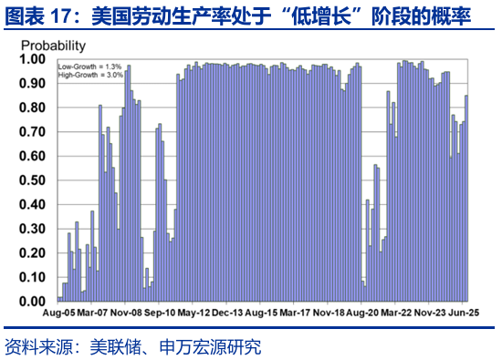 AI革命对生产率的提振效果已有所显现,但空间仍较大。上文提到,AI技术革命刺激资本开支,对于美国经济增速、股市均具备较大意义。不仅如此,此类“通用技术”也会带动全社会效率提升,类似的先例为内燃机、因特网等。根据AI提升工作效率的微观特征,AI的应用或可提升劳动生产率(Output per hour)。过去几年,美国劳动生产率增速相较疫情前的确有所提升,结构上,也可观察到AI相关产业的效率提升,如数据处理业。但是,此轮劳动生产率增速还未摆脱“低增长”区间。一方面,2019-2024年,美国劳动生产率增速为2.1%,仍低于1990-2000年、2000-2007年的2.2%、2.7%;另一方面,根据Kahn-Rich生产率趋势模型,截止2025Q2,美国处于劳动生产率“低增速”阶段的概率高达85%。