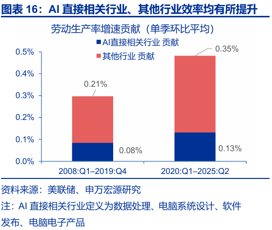 宏观视角下,2025年美国AI投资对经济增速的贡献与居民消费基本持平,但不可忽视进口的拖累。由于美国居民消费占GDP比重达70%左右,因此在一贯认知中,美国经济往往是由居民消费推动的。但是,2025年上半年,美国居民消费、AI相关投资(电脑设备、软件、数据中心)分别贡献实际GDP增速1.1、1.0个百分点,几乎持平。从历史上来看,2025年AI相关投资对经济增速的贡献已经超过90年代;但是,电脑设备投资对应电脑资本品进口,两者存在较强关系。并且,自2023年以来,美国电脑设备“净投资”(投资-进口)对经济呈现负贡献。所以,2025年上半年美国AI投资的确强劲,但若忽视进口拖累,就会显著高估AI投资的经济效益。