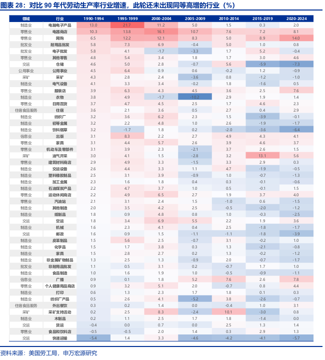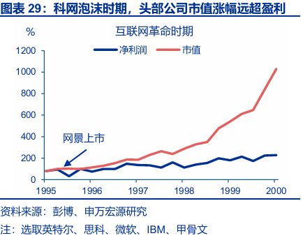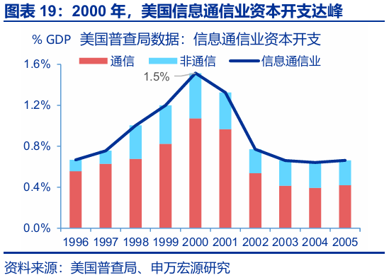 回顾历史,90年代美国互联网革命的特征为投资火热、生产率提升、成本下降。1)投资方面,美国信息通信资本开支占GDP比重在2000年达峰;2)美国劳动生产率增速提升,1995Q4-2004Q2增速高达3.1%;3)成本方面,电脑设备投资价格指数同比一度低至-25%。