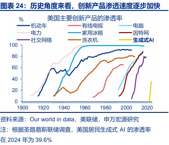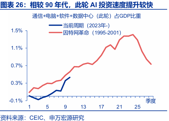 回顾历史,90年代美国互联网革命的特征为投资火热、生产率提升、成本下降。1)投资方面,美国信息通信资本开支占GDP比重在2000年达到顶峰。90年代后期,电脑设备投资增速一度高达50%;2)随着个人电脑渗透率、因特网渗透率提升,美国劳动生产率增速随之提升,1995Q4-2004Q2增速高达3.1%,2022Q4-2025Q2增速仅为2.2%。3)成本方面,由于半导体技术突破和生产效率提升,90年代电脑、软件等设备投资成本下降。