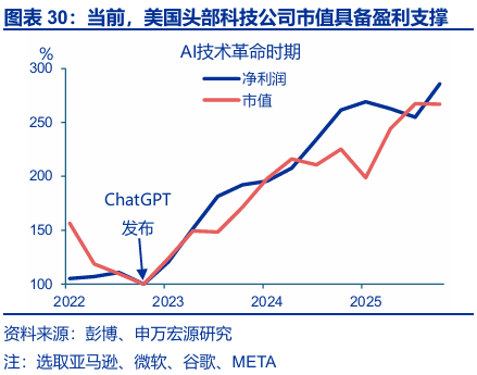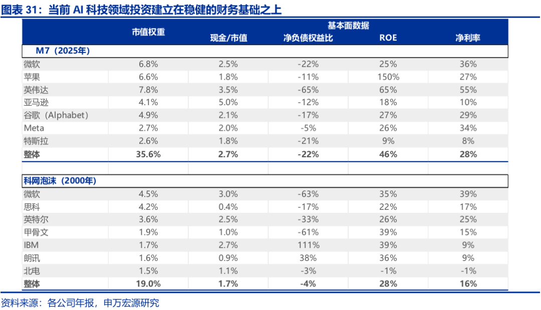 美国AI革命、资本开支是否处于“泡沫”之中?根据上文分析,投资、生产率、成本三大领域显示美国AI革命处于初期,AI提振生产率“任重道远”。过去几年,市场对于此轮美国AI资本开支可持续性的担忧层出不穷,甚至担忧在Mag7一骑绝尘的涨幅背后,存在着资产价格泡沫。从以下两个层面来看,当前AI热潮或并不处于“泡沫”之中:1)对比科网泡沫时期与当前头部科技公司的市值、净利润变化可见:互联网革命时期,头部科技公司市值涨幅远超利润;而2022年以来,头部公司市值涨幅与利润仍相对匹配,这表明股市上涨及资本开支加码背后有盈利支撑;2)从财务数据来看,Mag7公司现金/市值、ROE、净利率均高于科网泡沫时期的头部公司,说明当前AI科技领域投资建立在稳健的财务基础之上。