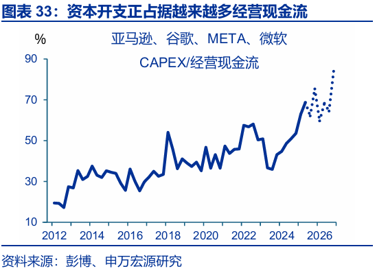 1)资本开支增加消耗自由现金流,科技企业寻求外部融资需求增加。根据市场预期,美国主要科技企业2026至2027年的资本开支力度仍将进一步提升。过去几年,科技企业资本开支提升已占据越来越多的经营现金流,导致企业自由现金流下降,进而推高了科技企业从外部融资的需求。这意味着,美国科技企业未来的资本开支,或将更容易受到融资环境、市场对回报率诉求的影响;