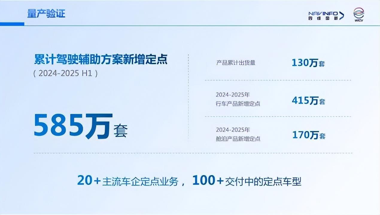 同时,程鹏公布了四维图新智驾业务的最新进展:2024年至2025年上半年,四维图新与鉴智机器人累计获得585万套智驾方案的新增定点,覆盖20余家主流车企,100余款定点车型,量产订单处于行业领先位置。