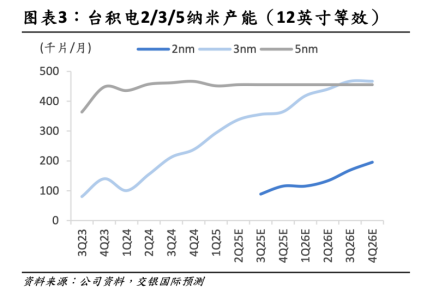 为应对政策风险,台积电已宣布650亿美元美国投资计划,包括建设三座晶圆厂,并追加1000亿美元用于新建三座晶圆厂、两座封装厂及研发中心。交银国际数据显示,其美国一期4nm工厂已于2024年底投产,二期3/2nm工厂及三期2/1.6nm工厂将分别于2027年和2030年左右投产。但即便按长期预测,美国2纳米产能也仅占台积电总产能的30%,与政策要求的本土生产比例仍存在显著差距。