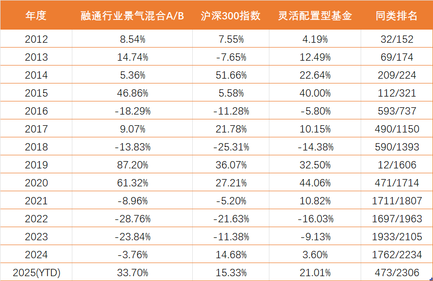 然而2021年成为其投资生涯的分水岭。受市场环境变化与风格切换影响,其投资策略遭遇严峻挑战。融通行业景气混合A连续四年亏损且排名靠后,累计收益率大幅回撤。截至卸任时,该基金累计管理时间超过13年,累计收益率161.31%,同类排名跌至87/157,甚至滑入后50%区间。