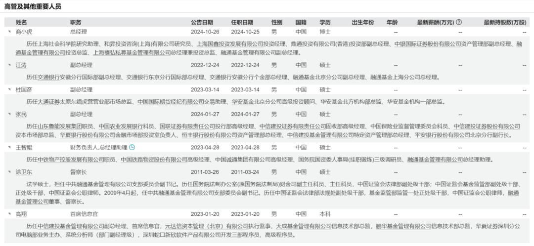 2022年12月,圆信永丰基金原副总经理江涛加盟出任副总经理;2023年3月,华安基金原骨干杜国彦转会担任副总;同年4月,旧将商小虎被重新召回并聘任为副总经理。进入2024年,调整持续深化:1月平安银行北京分行原副行长张民履新副总;4月原总经理张帆离任,由商小虎代行职责;10月25日商小虎正式出任总经理。