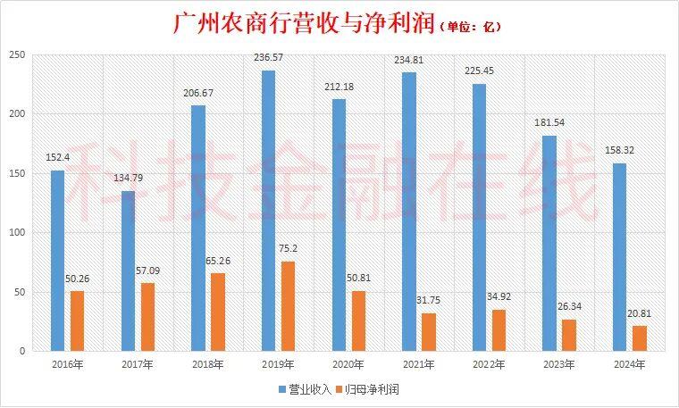 2024年,广州农商行实现营业收入158.32亿元,同比下降12.79%;实现净利润24.16亿元,同比下降25.89%;实现归母净利润20.8亿元,同比下降21.02%。