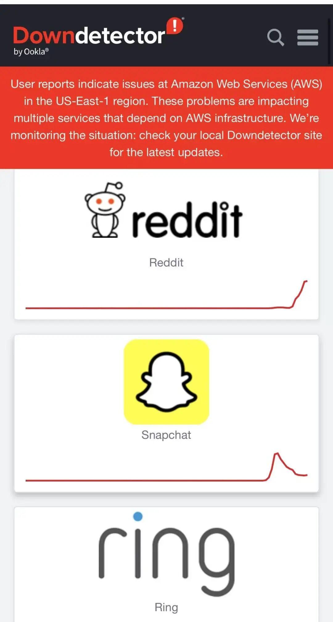 然而,值得注意的是,北京时间10月20日下午,除了多邻国之外,还有多个互联网应用程序和平台也突然陷入了“瘫痪”状态。最新消息显示,此次“掉线”事故与亚马逊Amazon Web Services(简称“AWS”)服务突发故障有着密切关系。