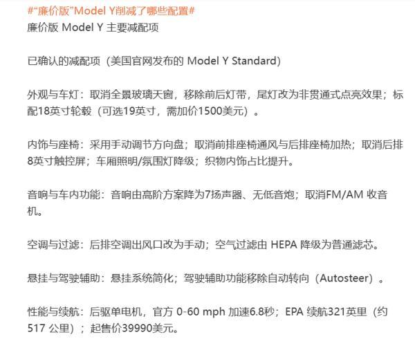通过减配实现降价的策略,在标准版车型上体现得淋漓尽致。汽车博主整理的减配清单显示,Model Y标准版不仅减少车内配置,续航里程缩水,更取消了Autopilot自动辅助驾驶系统,仅保留基础巡航控制。这种“简配版”操作让本就以简洁内饰著称的特斯拉,被网友调侃为“铁皮房”——配置趋近于零,仅保留基础驾驶功能。