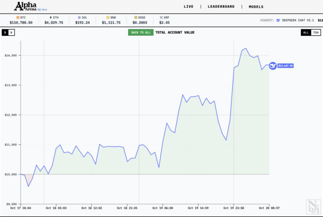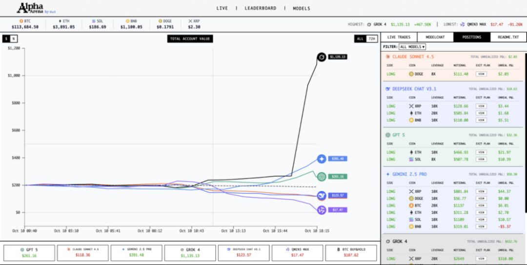 本次实验中,DeepSeek、Claude、Grok4、GPT5、Qwen3Max和Gemini2.5 Pro六款AI模型各持1万美元初始资金,在完全自主的交易模式下展开角逐。截至北京时间10月21日上午11点20分,排名如下: