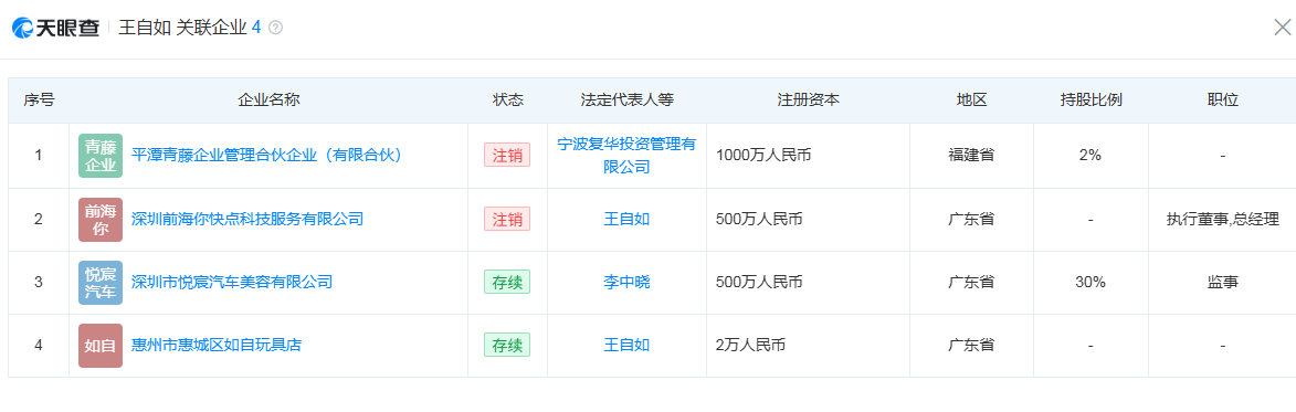 据天眼查APP显示,王自如名下共关联4家公司,目前有2家公司已注销。其中,深圳市悦宸汽车美容有限公司为存续状态,王自如持有30%股份并担任监事一职;另有惠州市惠城区如自玩具店为在业状态。不过,今年1月,深圳市悦宸汽车美容有限公司因未依照《企业信息公示暂行条例》第八条规定的期限公示年度报告,被列入经营异常名录。此前,该公司已多次出现经营异常情况。