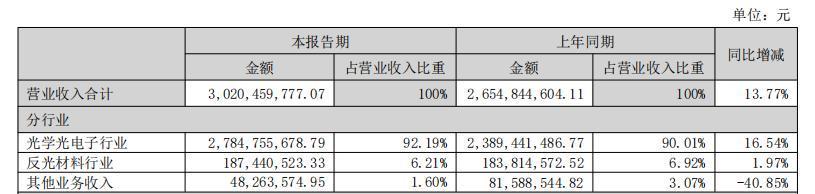 目前,水晶光电营收主要来源于消费电子的光学元器件、薄膜光学面板,二者营收占比超90%,是绝对的业绩支柱。