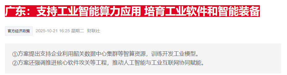 广东省人民政府办公厅印发《广东省人工智能赋能制造业高质量发展行动方案(2025—2027年)》,鼓励地市设立“模型券”,支持企业购买工业模型服务。同时,依托专业机构建立工业模型评测体系,评估工业模型综合能力。