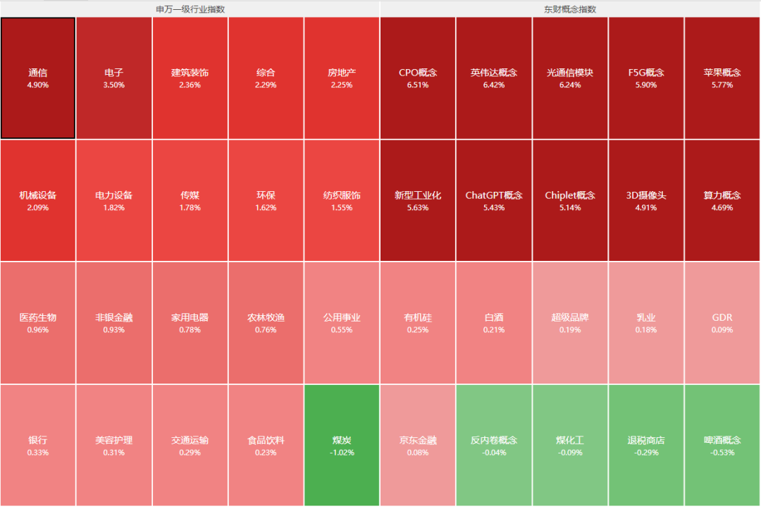 最后,简单看下盘面情况。截至收盘,上证指数涨幅为1.36%,创业板指涨幅为3.02%,港股恒生指数涨幅为0.65%,恒生科技指数涨幅为1.26%。分行业来看,通信、电子、建筑装饰、综合、房地产等行业领涨,煤炭行业下跌。