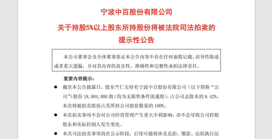 早在9月23日,宁波中百就曾发布公告称,公司于2024年12月25日收到山东省青岛市中级人民法院(以下简称“青岛中院”)作出的《执行裁定书》。根据裁定书内容,青岛中院将拍卖公司股东竺仁宝持有的1888.4万股无限售流通股股票。截至公告披露日,竺仁宝所持有的这部分股份均处于司法冻结状态,占其所持公司股份的100%,占公司总股本的8.42%。