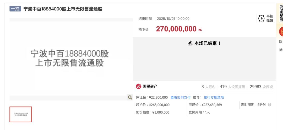 根据阿里司法拍卖平台的信息,上述股权的司法拍卖时间为2025年10月20日上午10时至2025年10月21日上午10时。10月20日,在杭州金帝加价之后,便再无人出价,最终杭州金帝以2.7亿元的总价竞得宁波中百1888.4万股,折合每股价格为14.3元。
