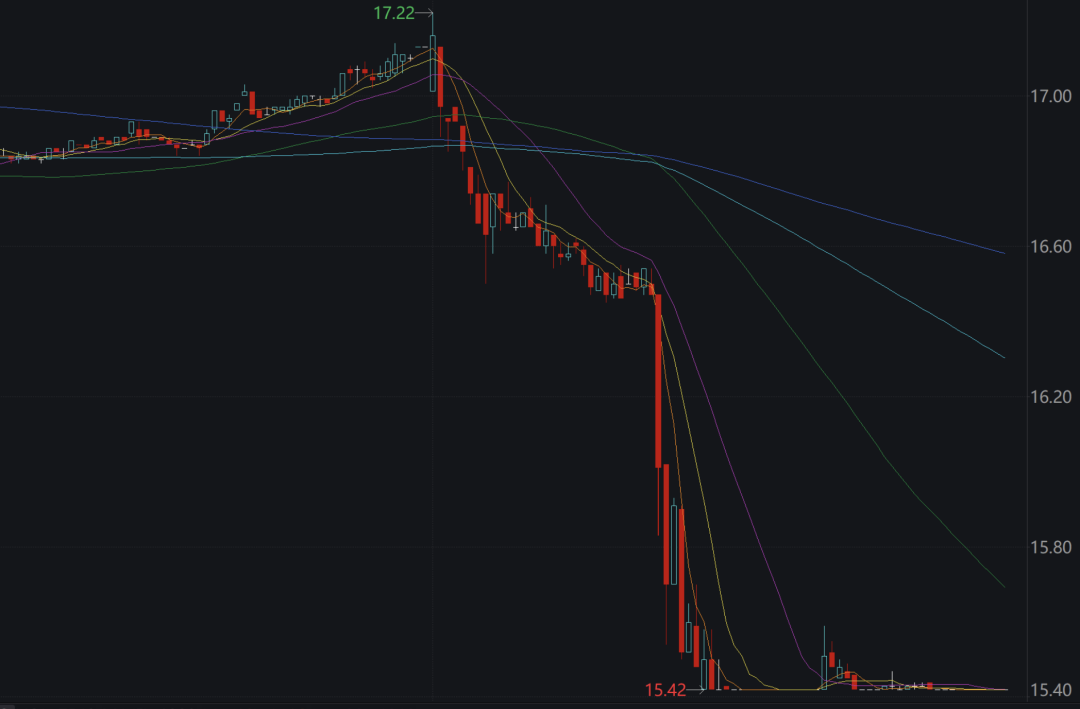 然而,在今日10时法拍正式结束时,宁波中百的股价却于10点01分突然闪崩,迅速封在跌停板上,股价跌至15.42元/股。