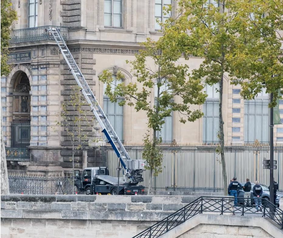 当地时间10月19日上午9:30,即博物馆开放后不久,四名嫌疑人乘坐载有机械升降机的车辆抵达,通过塞纳河畔一侧的阳台进入阿波罗画廊。现场照片显示,一架梯子架设至一楼窗户。两名窃贼使用电动工具切开窗户闯入室内,随后威胁安保人员撤离现场,并切开两个珠宝展柜的玻璃。据法媒报道,初步调查显示被盗区域三分之一的房间,未安装闭路电视监控。警方称,犯罪团伙仅在馆内停留四分钟,便于9:38分乘坐两辆在外接应的摩托车逃离现场。