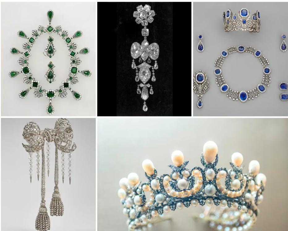 被偷走的珠宝:上排(左起):拿破仑送给玛丽·路易丝的结婚礼物套装中的项链和耳环;欧仁妮皇后的胸针;蓝宝石套装头饰、项链和耳环。下排:欧仁妮皇后的装饰蝴蝶结(左)和王冠(右)