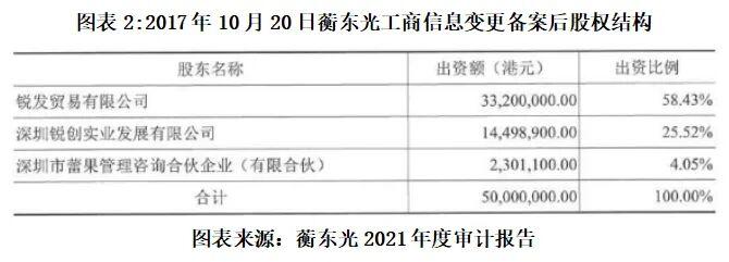 申报IPO前夕,2024年11月27日,彼时新三板挂牌的蘅东光发布了多份公告,其中的2021年度审计报告显示,2017年10月20日,蘅东光进行工商信息变更备案。本次变更后,蘅东光的股权结构分别为锐发贸易有限公司(下称“锐发贸易”)出资58.43%、深圳锐创实业发展有限公司(下称“锐创实业”)出资25.52%、深圳市蕾果管理咨询合伙企业(有限合伙)出资4.05%,三名股东的合计出资比例为100%。