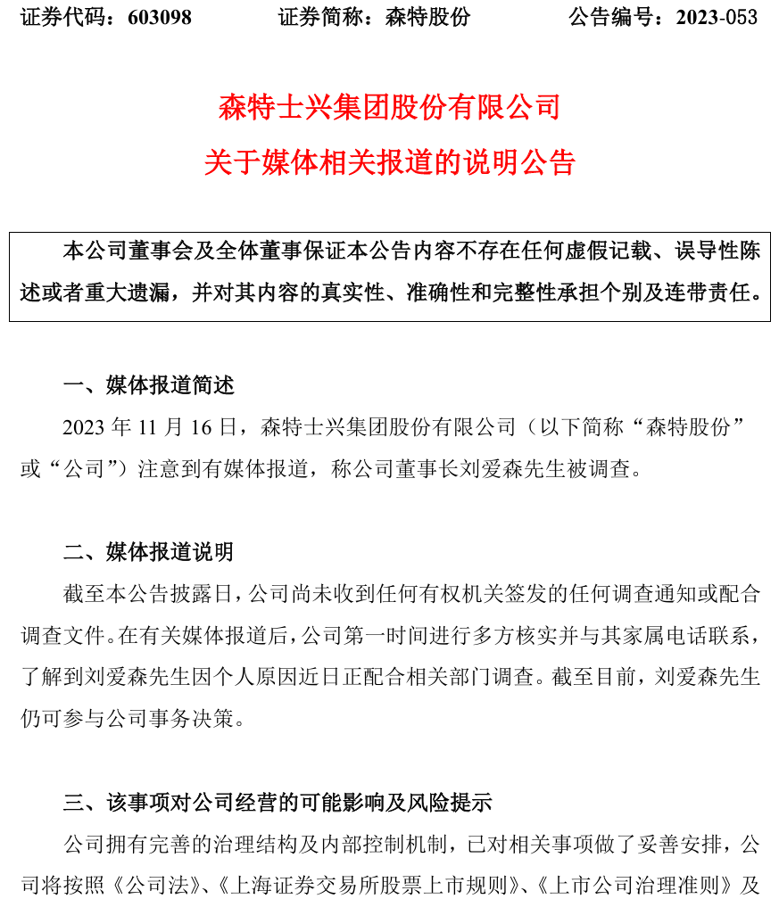 据知情人士透露,罗新文被留置前后,森特股份董事长刘爱森也被湖北纪检部门带走调查,一度羁押于老河口市看守所。2023年11月17日盘后,森特股份公告称,刘爱森因个人原因正在配合相关部门调查,但目前仍可参与公司事务决策。