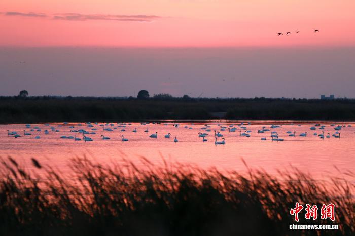 在东营黄河入海口,一群天鹅在夕阳下栖息觅食。(资料图)梁犇 摄