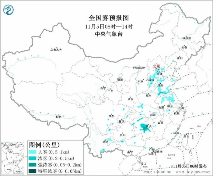 中央气象台今晨还发布了大雾黄色预警。预计11月5日早晨至上午,北京东南部、天津中西部、河北中南部、山东西部和南部、江苏中北部、安徽北部、湖南中北部等地的部分地区将出现大雾天气,局地有能见度不足200米的强浓雾。