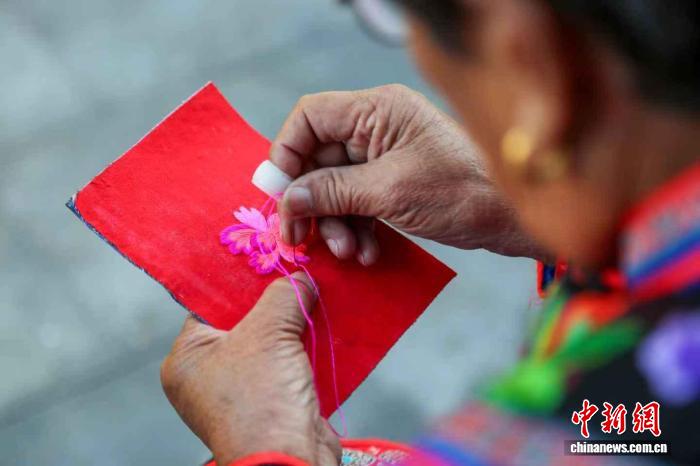 9月26日,内蒙古科右中旗,年过花甲的绣娘曹海杰依旧坚持用传统刺绣方法创作。中新社记者 张玮 摄