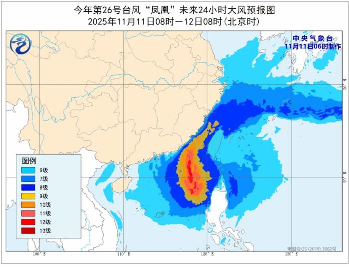 受台风‘凤凰’影响,预计11日08时到12日08时,东海南部海域、台湾以东洋面、黄岩岛、中沙群岛、南海大部、浙江沿海、福建沿海、广东沿海、台湾岛沿海将有6~8级、阵风9~10级的大风,台湾海峡、巴士海峡、南海东北部和中东部的风力可达9~11级,阵风12~13级,台风‘凤凰’中心经过的附近海域和地区风力可达12~13级,阵风14~15级。