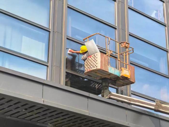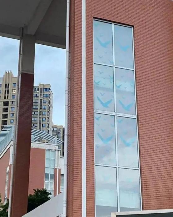 一处建筑物的玻璃贴上了预防鸟撞贴纸。图片来源:北青网