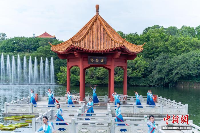 国庆节假期,莲花湖鹭鸟栖息地每日上演山水实景快闪。图为舞者身披湖水蓝裙装,以飒爽棍舞演绎巾帼气概。主办方供图
