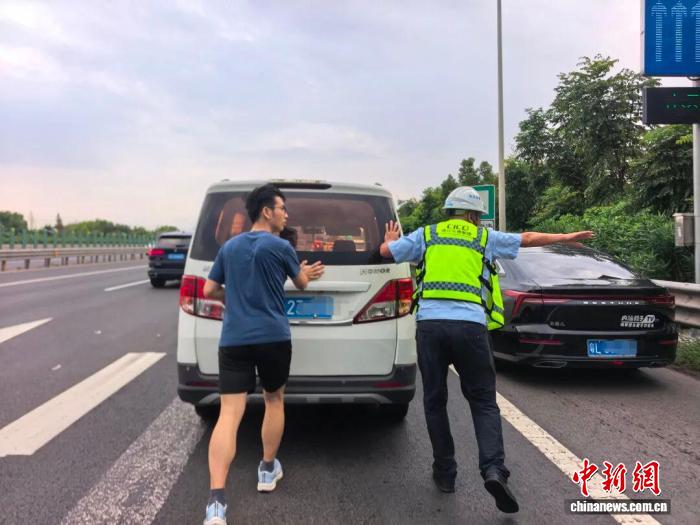 9月30日17时,在三门方向道墟枢纽附近,金宏良发现一辆白色面包车打着双闪停在车道中间,两名司乘围着车查找故障原因,后方车辆逐渐排起了长龙。“别站在这里,太危险了,先挂空挡,我们一起先把车推边上去。”他引导两名司乘一起将面包车缓缓推移至应急车道,随后跑到预警车后方,引导后方车辆提前变道避让。