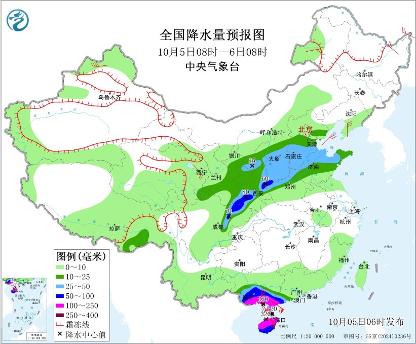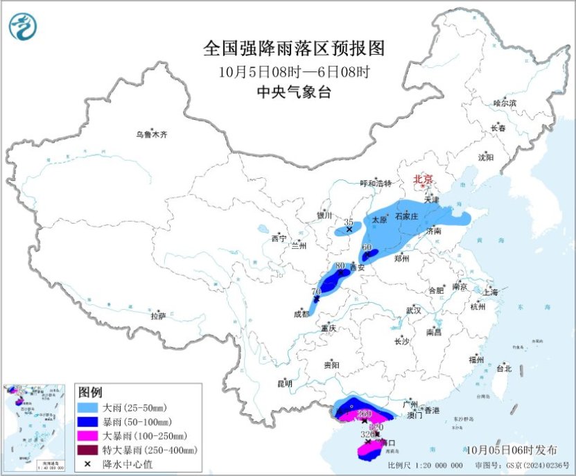 10月5日08时至6日08时,西北地区东部、华北中西部和南部、黄淮东部、四川盆地北部、华南南部和海南岛等地部分地区有大到暴雨,其中,广西南部、广东西南部、海南岛大部等地部分地区有大暴雨,广西东南部沿海、广东西南部沿海、海南岛北部等地局地特大暴雨(250~320毫米)。内蒙古东北部、黑龙江东北部、辽东半岛、青海东部等地部分地区有4~6级风,新疆北部、广西东南部等地部分地区有6~7级风,海南岛东北部部分地区有8~9级风。