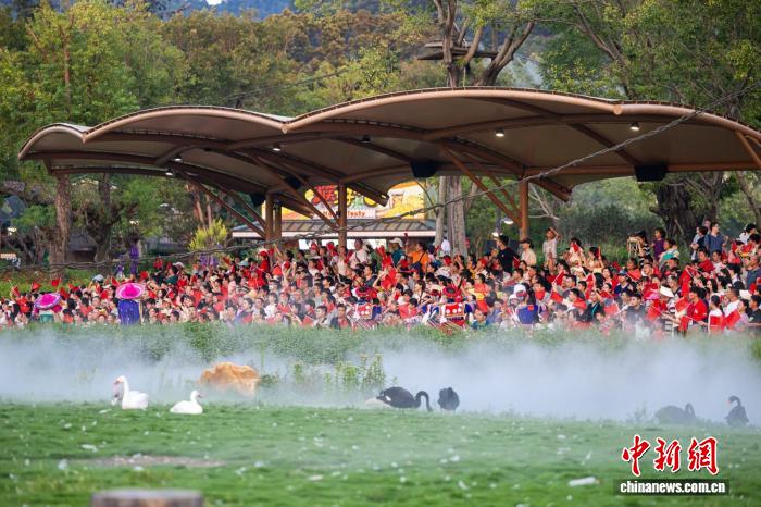清远长隆度假区总经理刘宏娟介绍,今年国庆节假期,园区推出了“五大神兽贺国庆迎金秋”主题活动,从白天的动物大迁徙表演、蒸汽小火车,到夜晚的温泉疗愈和主题故事会,每天多场各具特色的演艺和体验项目,确保游客从早到晚都感受到不间断的惊喜与欢乐。