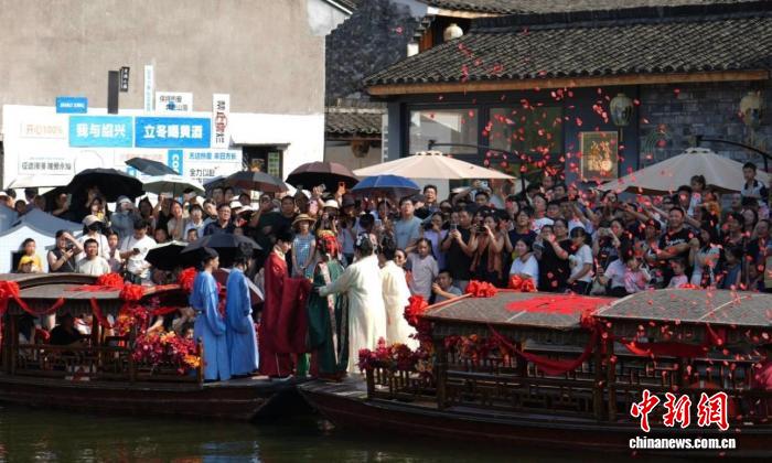 中新网绍兴10月7日电 (张斌)国庆中秋双节期间,浙江绍兴黄酒小镇(东浦)以“醉东浦·梦华录”大型沉浸式文化体验活动引爆文旅市场。